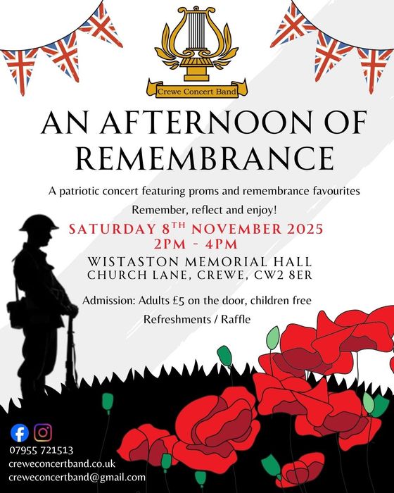 We rehearse every Thursday evening from 7:30pm - 9:30pm at Wistaston Memorial Hall, Church Lane, Crewe, CW2 8EZ.